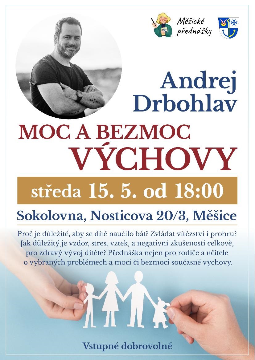 obec Měšice pořáda ve středu 15. 5. 2024 od 18:00 hod. přednášku "Moc a bezmoc výchovy" s Andrejem Drbohlavem.