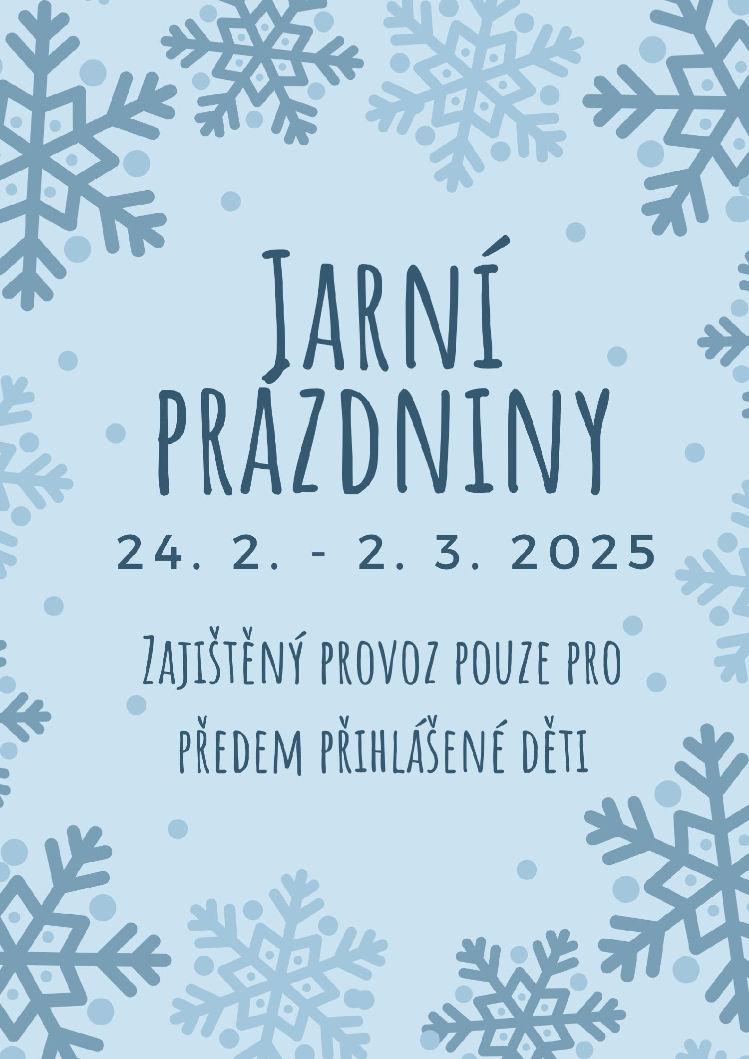 v období školních jarních prázdnin, v termínu 19. 2. - 23. 2. 2024, bude v naší mateřské škole zajištěný provoz pro přihlášené děti.