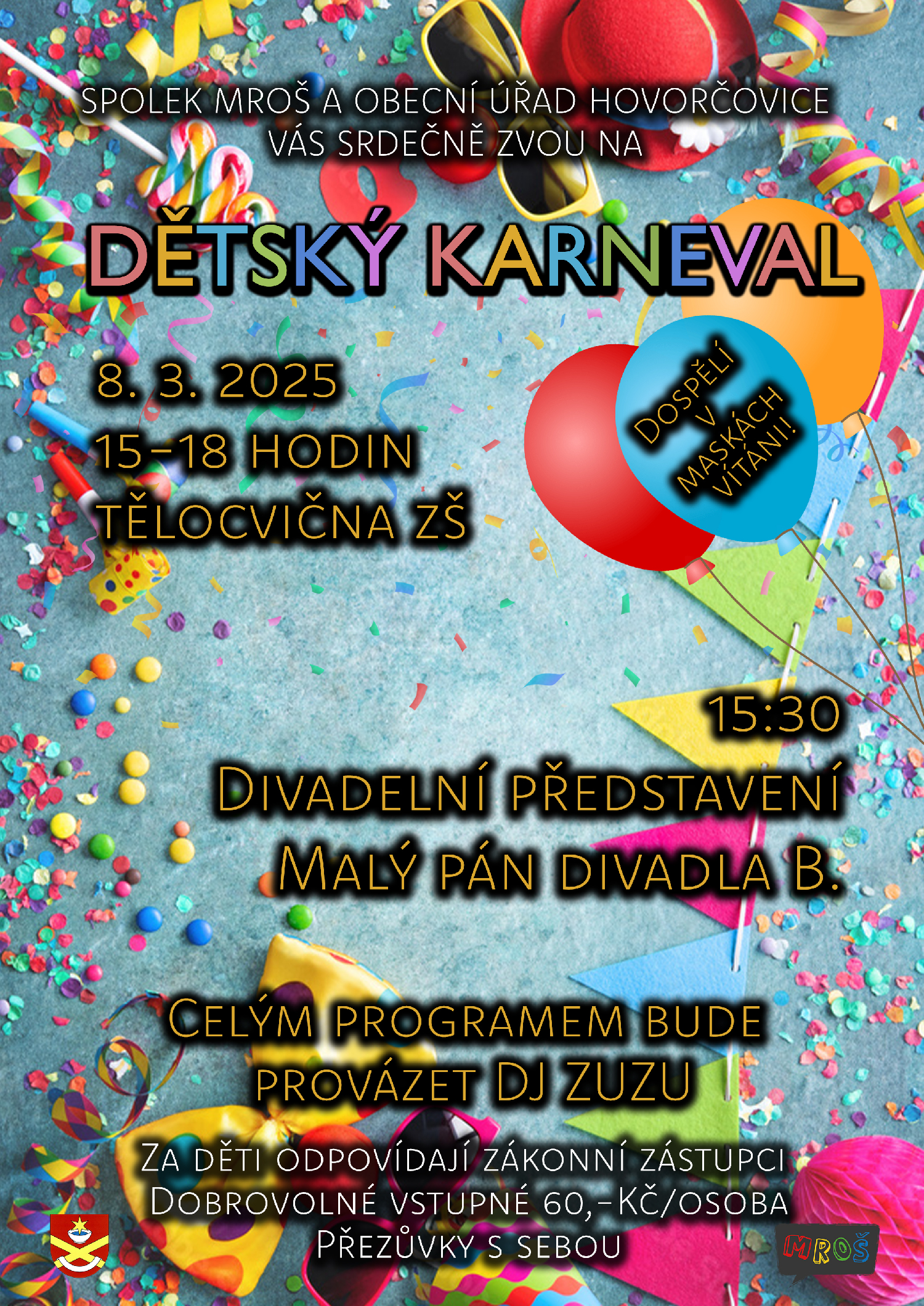 Holky, kluci zveme Vás v sobotu 8. 3. 2025 od 15:00 na již tradiční hovorčovický dětský karneval do naší školní TV haly. Můžete se těšit na divadelní představení Malý pán nebo na DJ Zuzu. Vstupné dobrovolné ve výši 60 Kč. Více na pozvánce zde.