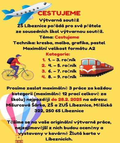 ZŠ Líbeznice pořádá pro sousední školy výtvarnou soutěž s tématem - Cestujeme. Termín odevzdání prací je do 18. 2. 2025. Zapojíte se? Více informací v letáčku zde.