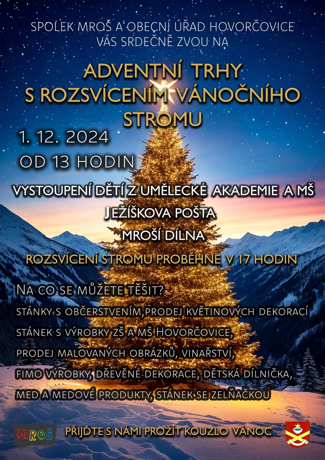1. prosince 2024Rozsvícení vánočního stromuSpolek MROŠ a OÚ Hovorčovice Vás srdečně zvou na Adventní trhy a rozsvícení vánočního stromu, které se koná první adventní neděli 1. 12. 2024 od 13:00 do 17:00. Přijďte se naladit na Vánoční atmosféru! Více informací naleznete
