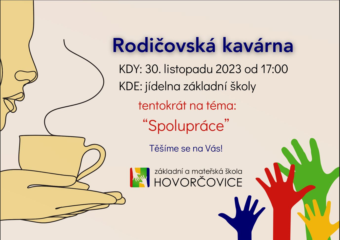 zveme Vás ve čtvrtek 30. 11. 2023 od 17:00 do jídelny naší základní školy na 2. Rodičovskou kavárnu v tomto školním roce. Budeme se zabývat tématem - SPOLUPRÁCE. Více najdete zde. Těšíme se na další setkání!