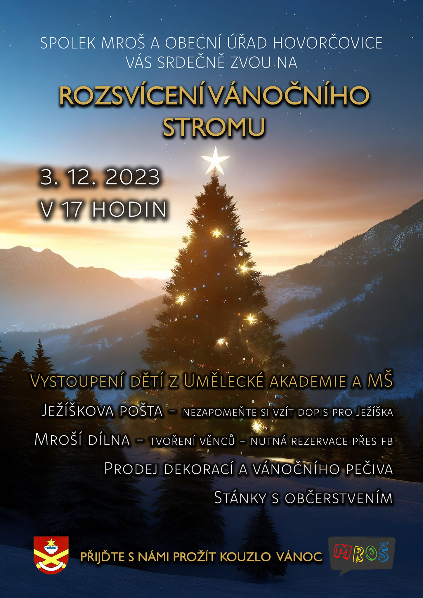 Spolek MROŠ a OÚ Hovorčovice Vás srdečně zve na akci Rozsvícení vánočního stromu, které se koná první adventní neděli, tj. 3. 12. 2023 od 17:00 v parku. Těšit se můžete na odpoledne plné vánoční pohody. Více zde.