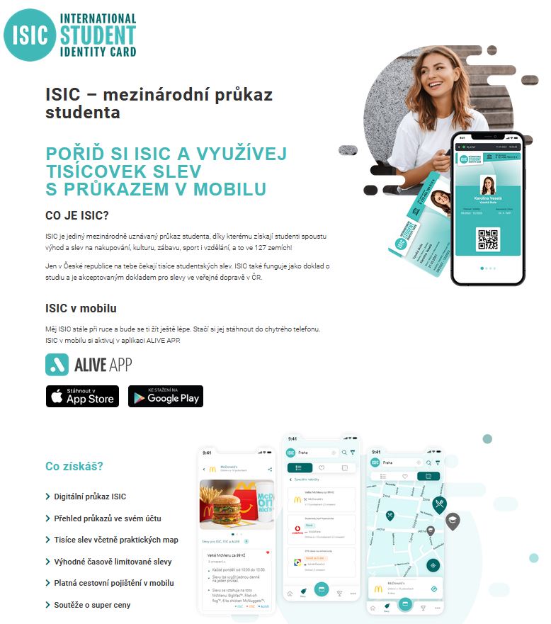 25. října 2023ISIC v mobilu jedině s AliveAPPPokud již nechcete nosit u sebe Váš plastikový průkaz ISIC, ITIC či ALIVE, využijte novou mobilní aplikaci AliveAPP. Po stažení, založení si účtu a jednorázovém nahrání čísla Vašeho průkazu, budete mít svůj ISIC, ITIC či ALIVE stále při ruce a nejnovější akce i slevy na dosah. Více v letáčku