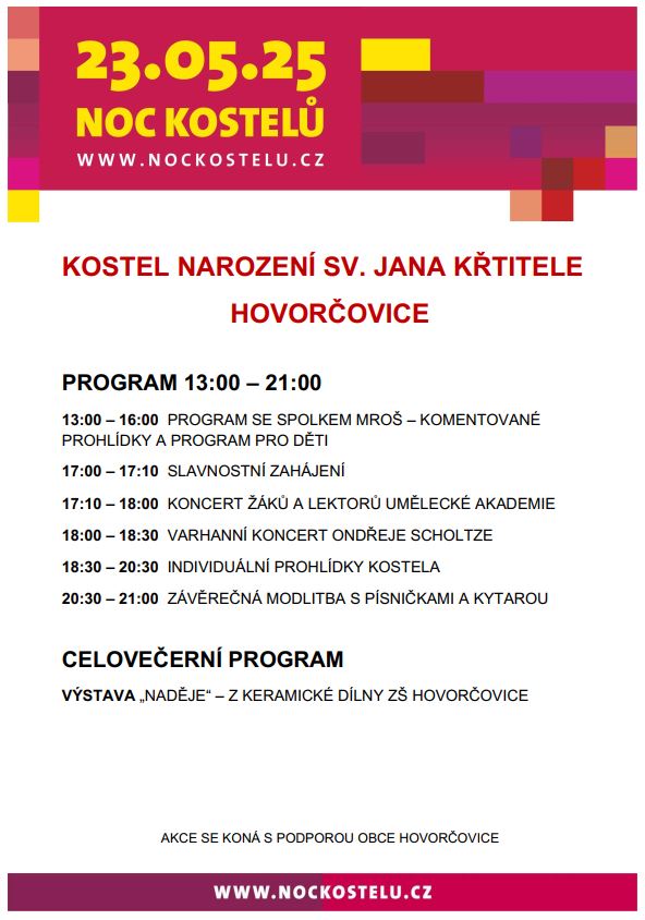 Spolek MROŠ a Umělecká akademie při naší základní škole srdečně zvou všechny zájemce v pátek 23. 5. 2025 na akci Noc kostelů. V neskutečné atmosféře hovorčovického kostela si poslechneme zvuk varhan, který rozezní mistr varhaník Ondřej Scholtz či koncert žáků a lektorů Umělecké akademie. Více o programu a doprovodných akcích se dovíte na webu spolku MROŠ nebo zde v letáčku.