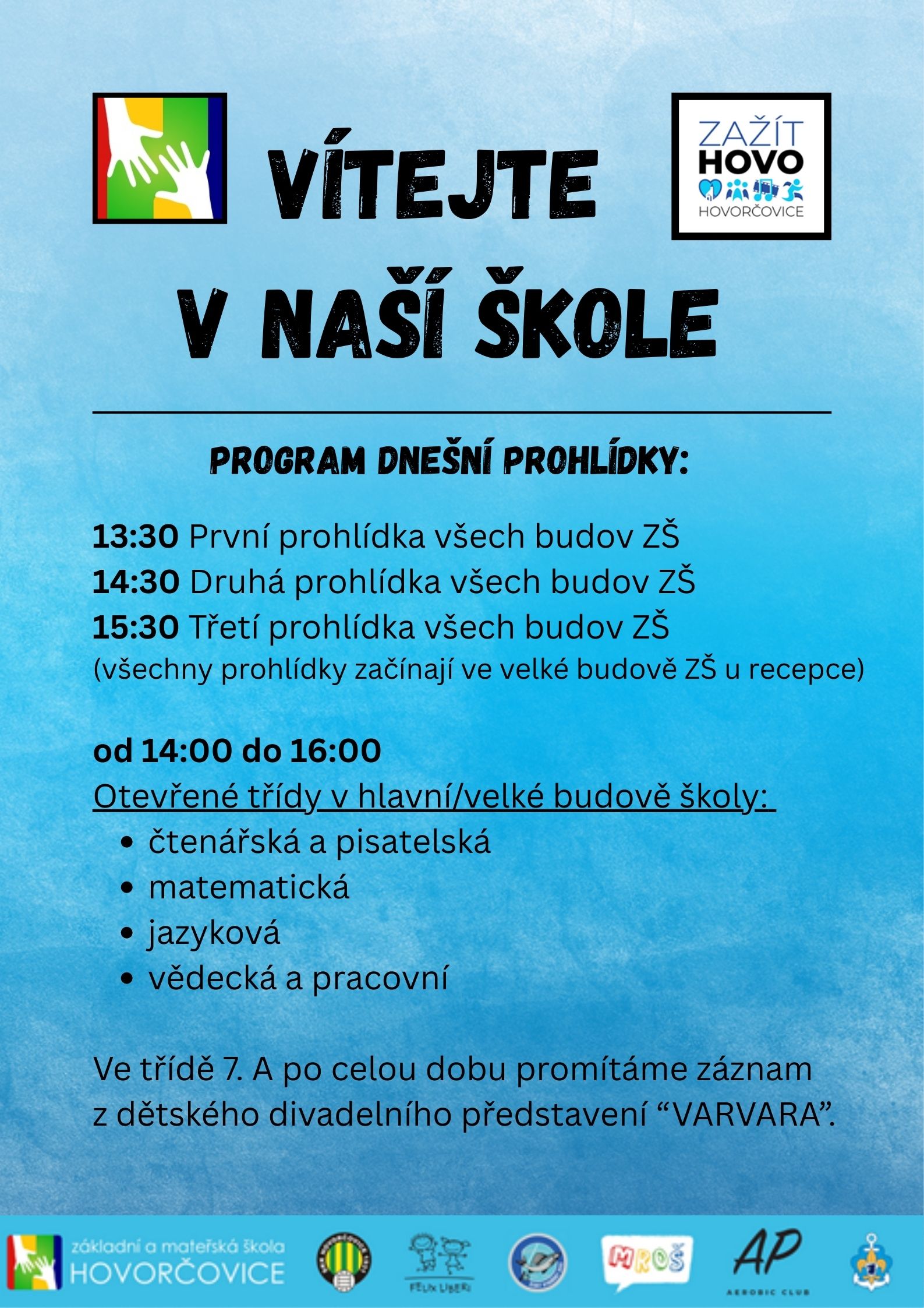 Děkujeme všem, kteří se v rámci akce Zažít Hovorčovice přišli podívat do naší školy, účastnit se prohlídky s paní ředitelkou, zažít dílny matematiky, českého jazyka, vědy, pracovních činností a cizích jazyků s našimi pedagogy. Moc jsme si to s vámi užili!