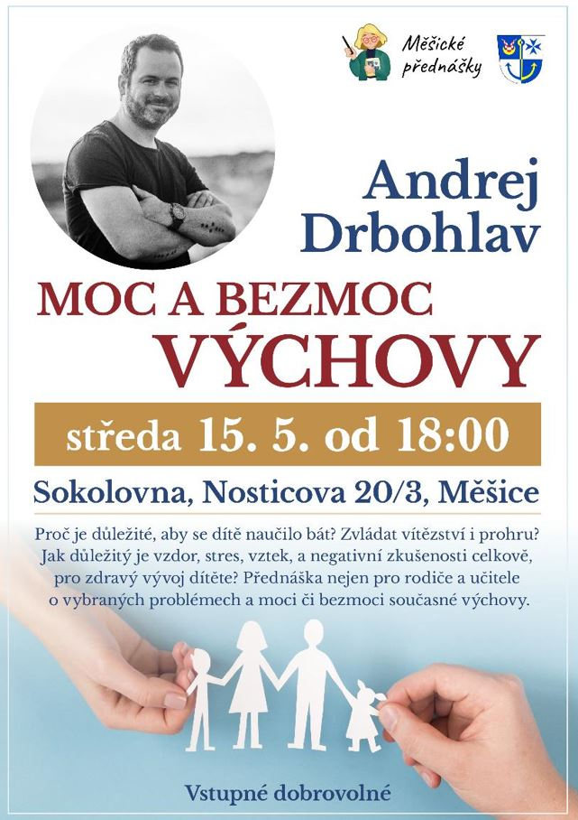 Zveme Vás ve středu 15. 5. 2024 od 18:00 do měšické sokolovny na další akci z cyklu Měšických přednášek tentokrát na téma Moc a bezmoc výchovy s Andrejem Drbohlavem. Více na plakátu zde.