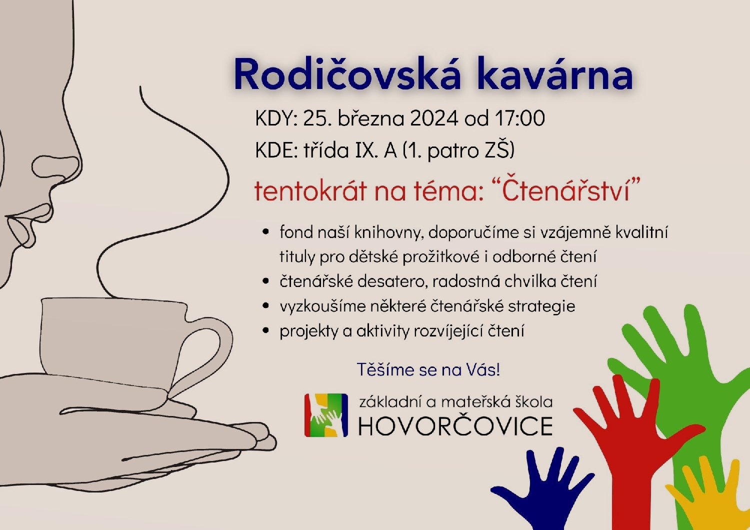 Zveme Vás na naši další rodičovskou kavárnu, která se koná v pondělí 25. 3. 2024 od 17:00 ve třídě IX.A. Tématem bude Čtenářství. Dozvíte se, co je to čtenářské desatero, vyzkoušíte si čtenářské strategie, doporučíme si zajímávé čtenářské tituly či si povíme něco o projektech, které podporují čtenářství v naší škole. Těšíme se na Vás! Více zde.