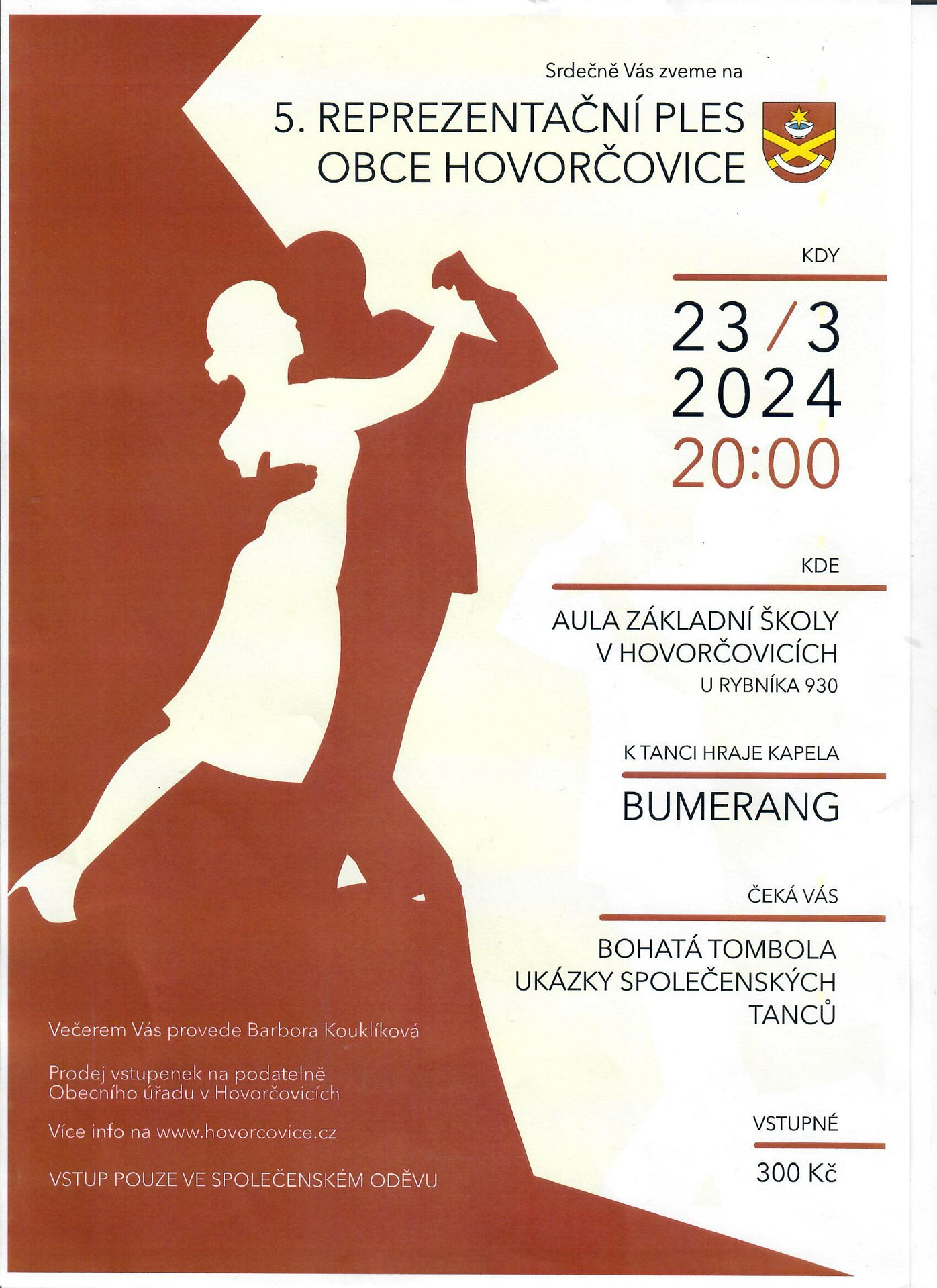 Obec Hovorčovice srdečně zve všechny na svůj 5. reprezentační obecní ples, který proběhne v sobotu 23. 3. 2024 od 20:00 v aule naší základní školy. Můžete se těšit na kapelu Bumerang, bohatou tombolu a ukázky společenských tanců. Více v pozvánce zde