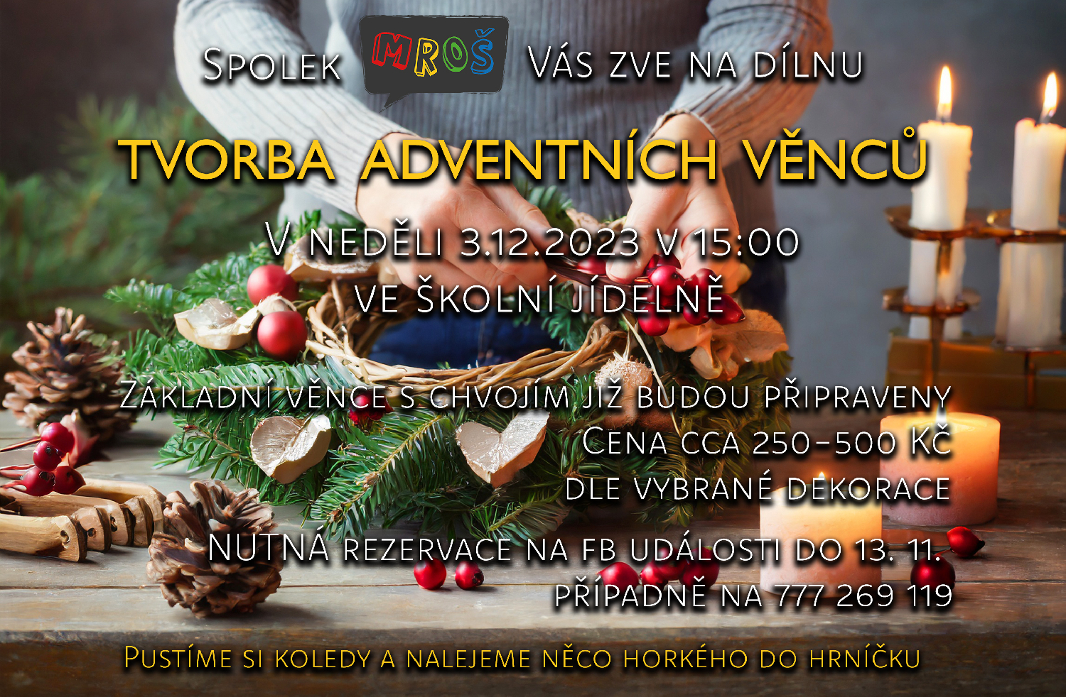Spolek MROŠ zve všechny zájemce do své adventní mroší dílny, která se bude konat v neděli 3. 12. 2023 od 15:00 v jídelně ZŠ. Náplní bude vázání adventních věnců, a proto je nutná rezervace místa již do 13. 11. 2023! Více informací k této akci najdete v letáčku zde nebo na facebookových stránkách spolku MROŠ.