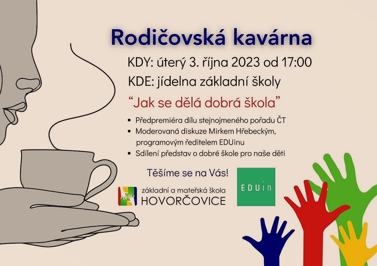 zveme Vás v úterý 3. 10. 2023 od 17:00 do jídelny naší základní školy na 1. Rodičovskou kavárnu v tomto školním roce. Budeme se zabývat tématem - Jak se dělá dobrá škola. Součástí tohoto setkání bude předpremiéra jednoho z dílů stejnojmenného pořadu ČT. Následovat bude moderovaná diskuze, kterou provede Mirek Hřebecký, programový ředitel EDUinu. Více najdete zde. Pojďme si společně v respektu a důvěře sdělovat naše představy o dobré škole pro naše děti.