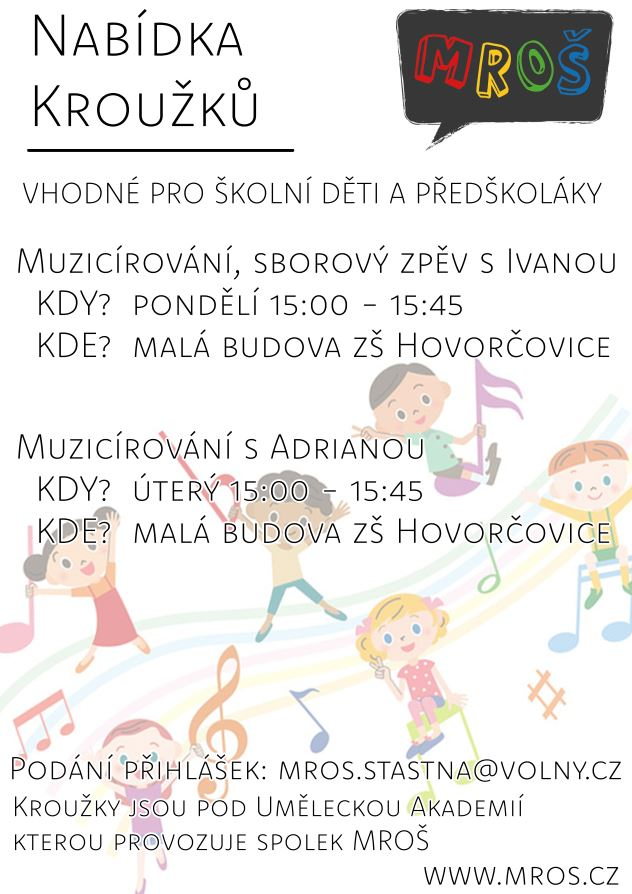 rádi byste se o naší škole dozvěděli více? Chtěli byste se zapojit do jejího dění? Přemýšlíte, jak škole pomoci? Jak ji vylepšit? Co ji nabídnout? Využijte každý měsíc schůzky našeho spolku MROŠ (My-Rodiče-Obec-Škola). Tentokrát již dnes ve středu 4. 10. 2023 od 19:30 na kurtech v Hovorčovicích.
